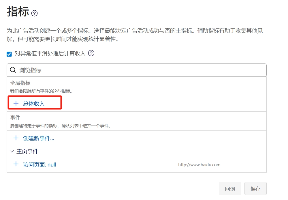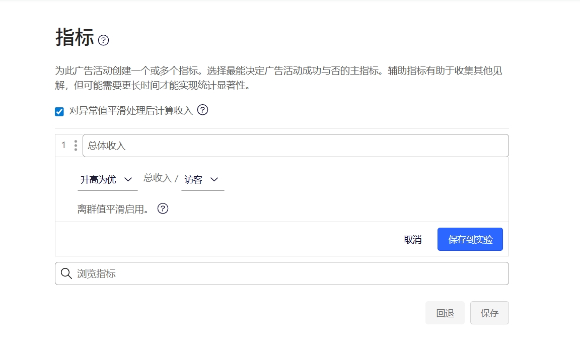 异常大的订单可能会严重影响或歪曲每位买家的平均收入。您应该为收入指标选中 对异常值平滑处理后计算收入,以便异常值不会扭曲您的实验结果。