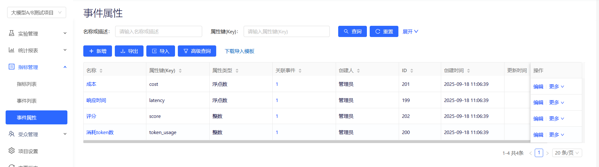 4.指标管理-》事件属性列表,查看事件属性,结果应如下图所示