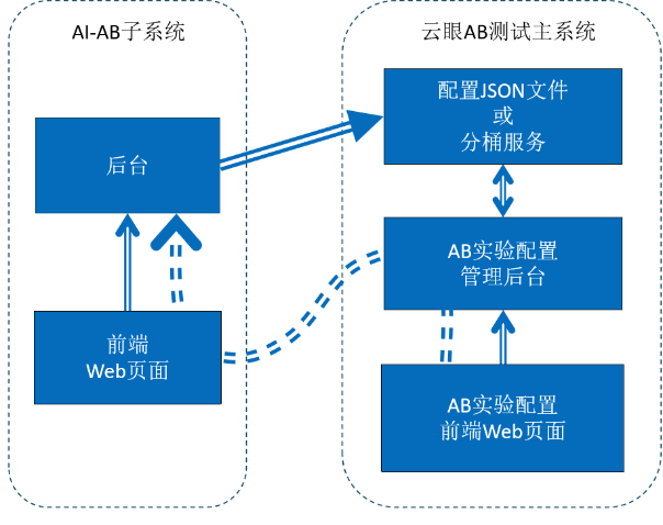 AI-AB 子系统与云眼 AB 测试主系统的协同基于 “主系统配置管控、子系统执行反馈” 的原则,二者职能边界清晰且协作高效,确保每一项功能均能对应到具体模块,避免功能重叠或职责模糊。