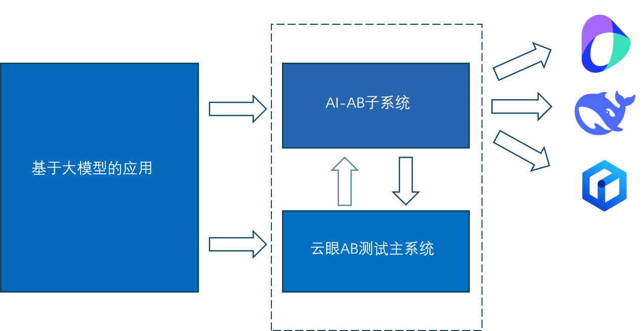 AIAB 系统(大模型应用专属 A/B 测试技术体系)是针对大模型应用从开发验证到上线迭代的全生命周期测试需求,构建的专业化技术方案,核心目标是解决传统测试方式在大模型场景下 “测试流程分散、决策依据模糊、流量管控低效” 的行业痛点。其架构基于 “前端交互 - 本地处理 - 后端管控” 的三层设计逻辑,形成 “AI-AB 子系统与云眼 AB 测试主系统” 的协同模式,与原理图呈现的模块分工及数据流向对应。